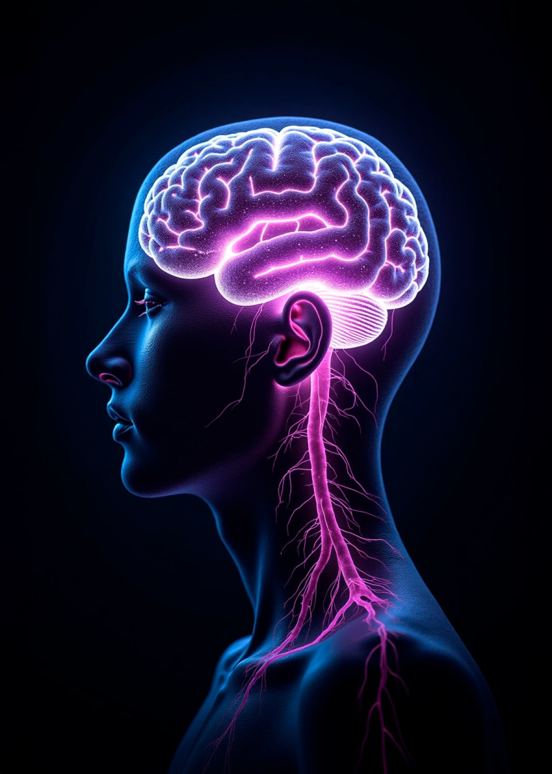Futuristic human brain made of glowing white and purple neon neural networks, highly detailed synapse connections, cyberpunk aesthetic, dark black textured background, ultra realistic lighting, intricate details, 8K, no text