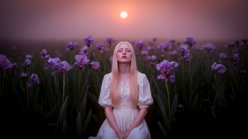 Hermosa mujer rubia con vestido blanco en un hermoso paisaje con flores color púrpura.