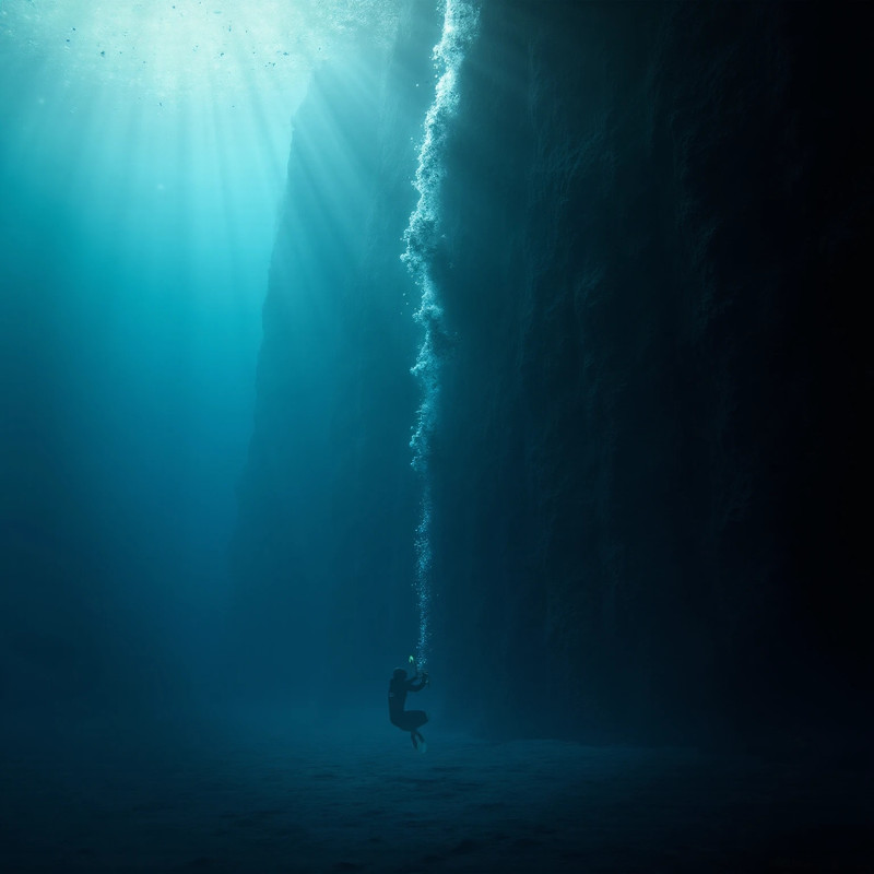 Escena submarina hiperrealista, 8K: un buzo solitario en medio del agua exhala una columna de burbujas mientras asciende junto a un acantilado oceánico vertical gigantesco; a la derecha, la pared rocosa oscura con textura recibe un oleaje blanco como cascada; arriba izquierda entra luz solar azul turquesa con rayos y partículas en suspensión; encuadre vertical con enorme espacio negativo hacia el abismo, alto contraste, tonos azul profundo/cian, sin texto ni logos.